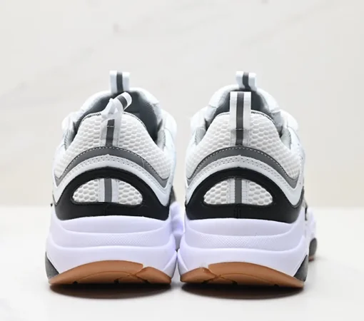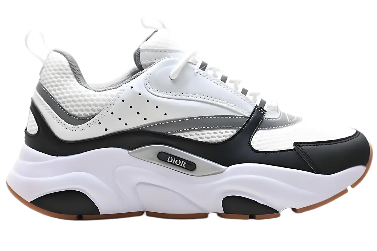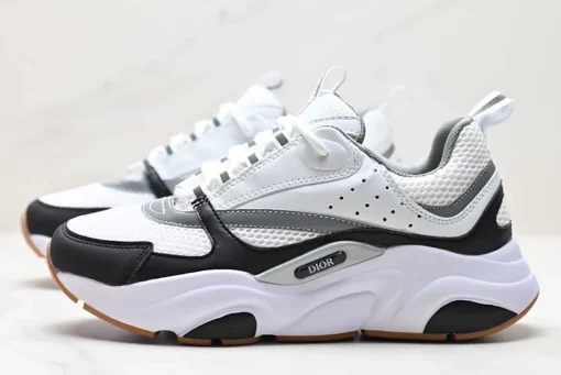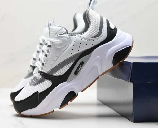Les baskets Dior B22 sont un modèle de sneakers de luxe pour homme, connues pour leur design audacieux et massif (dad shoe). Le modèle présenté sur l’image est entièrement blanc ou blanc et argenté.