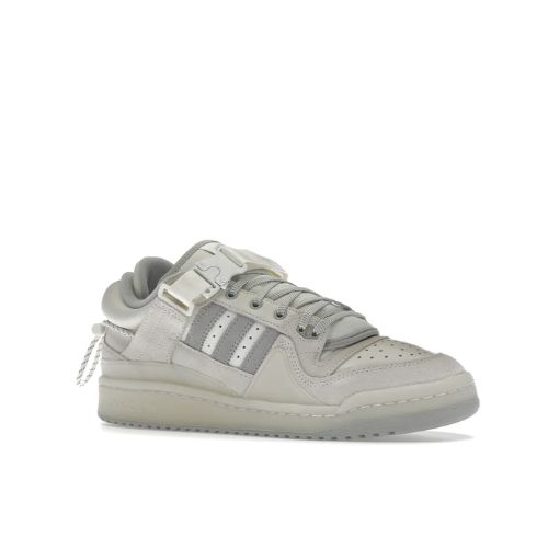The adidas Forum Buckle Low « Last Forum » is a collaborative sneaker with Bad Bunny that features an off-white leather upper, grey suede three-stripes and overlays, and a traditional adjustable ankle strap combined with a buckle closure system. Key details include a double tongue with the Bad Bunny « third eye » emblem, toggle lacing, and a translucent sole. It was released on December 10, 2022, and is the final colorway from the Forum Buckle Low collaboration.