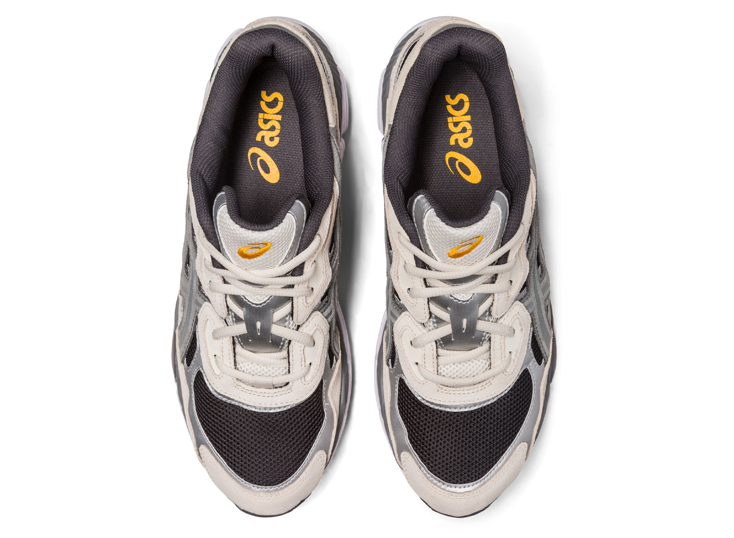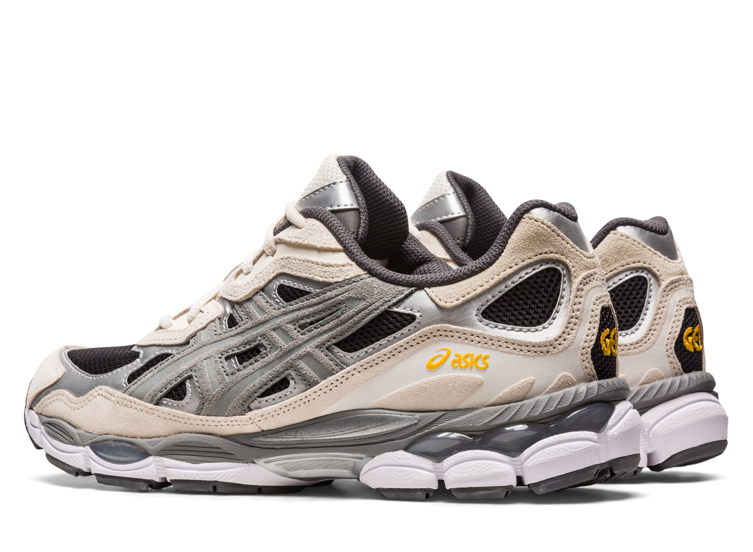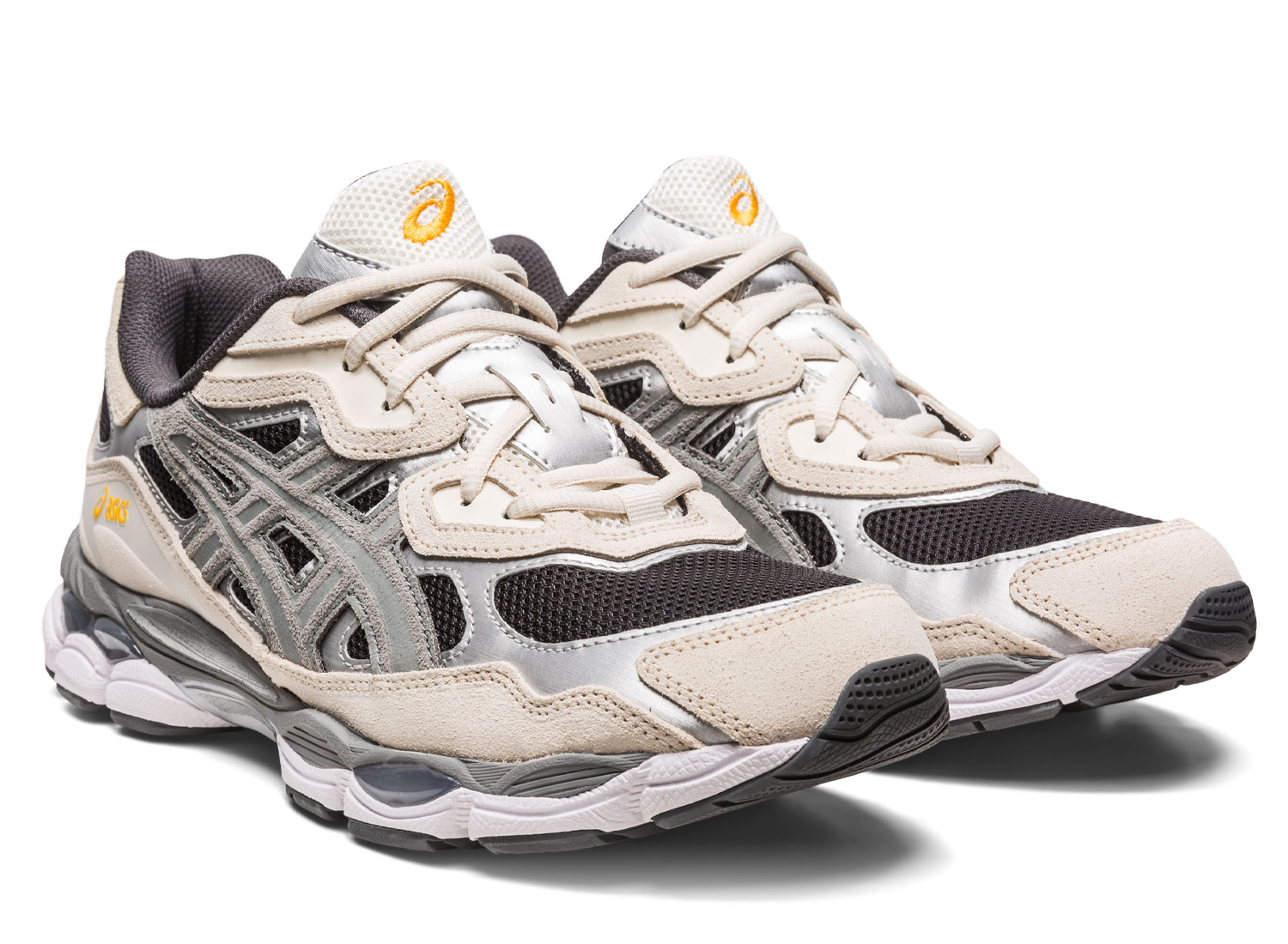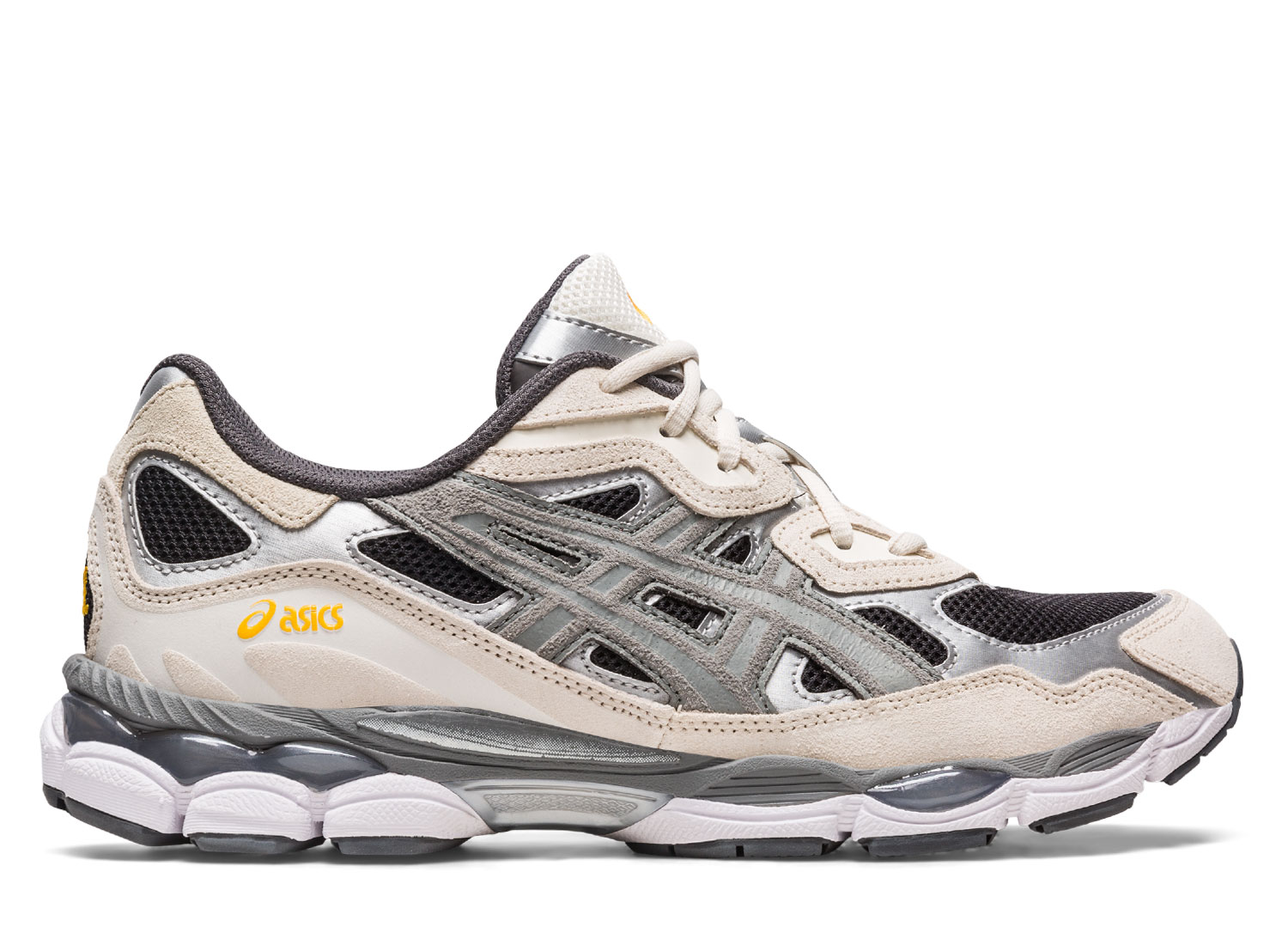 ASICS Gel-NYC, identifiée plus précisément comme le coloris « Cream / Steel Grey ». Ce modèle est une sneaker lifestyle qui fusionne des éléments de designs de course patrimoniaux avec une technologie de performance moderne.