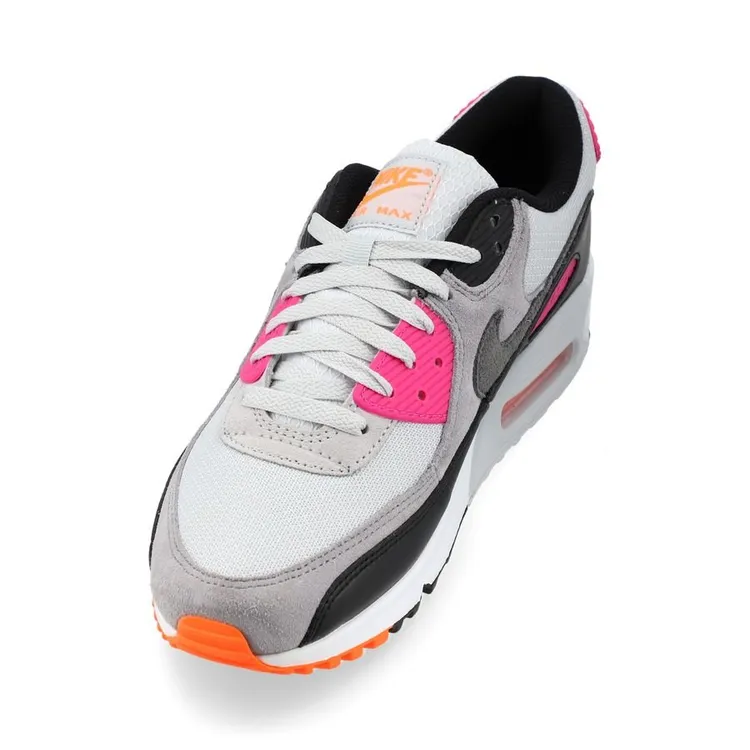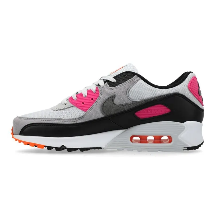 Nike Air Max 90 de couleur gris, rose et noir. Ce modèle est également connu sous le nom de coloris « Dunkin’ Donuts » en raison de sa ressemblance avec les couleurs de la célèbre chaîne de cafés et de beignets.