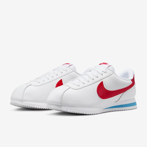 Marque : nike. Nom : cortez. Couleur :blanc-varsity red- varsity blue Description :The Nike Cortez is an iconic and classic sneaker, originally released in the late 1960s as a lightweight and comfortable running shoe designed by Bill Bowerman. Its revolutionary design featured a thick foam midsole for exceptional cushioning and a herringbone outsole for traction, which became the standard for running shoes at the time. While it evolved beyond performance running, the Cortez is now celebrated for its timeless and stylish design, which has been made in various materials like leather, suede, and nylon