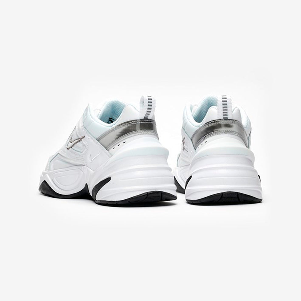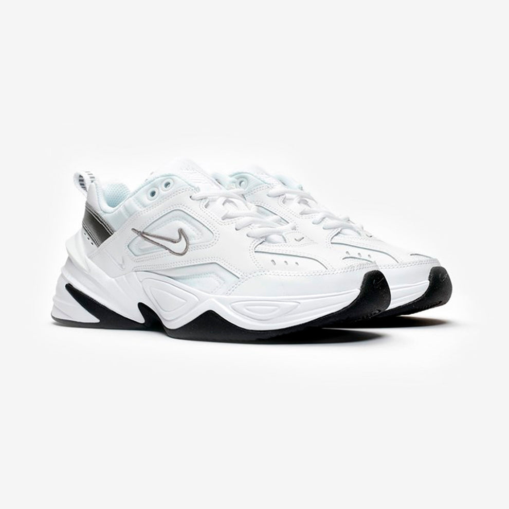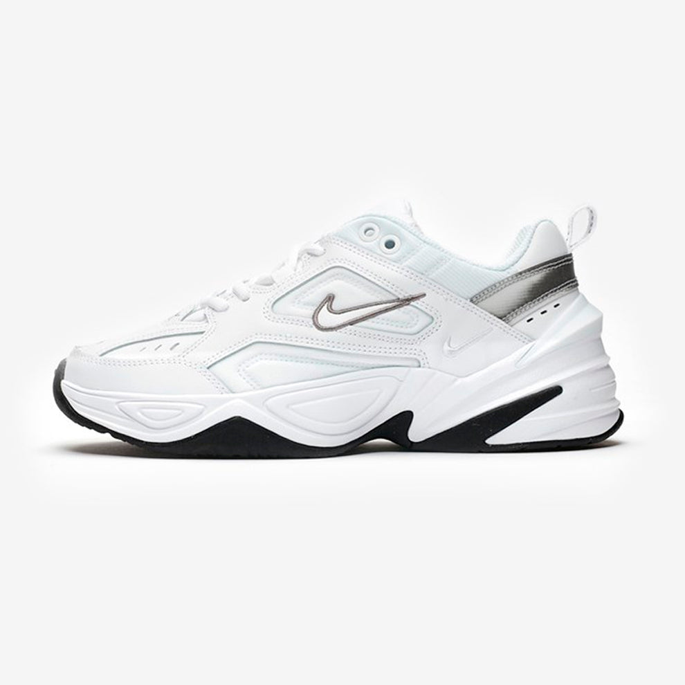 The Nike M2K Tekno is a women’s shoe that blends the classic, chunky « dad shoe » style of the Nike Air Monarch with modern, futuristic details. Key features include a layered upper made of real and synthetic leather, a thick, supportive EVA midsole, and a rubber outsole. The design is notable for its unique detailing like multiple logos, a pronounced heel clip, and sharp angles that create a modern look on a heritage-inspired silhouette.